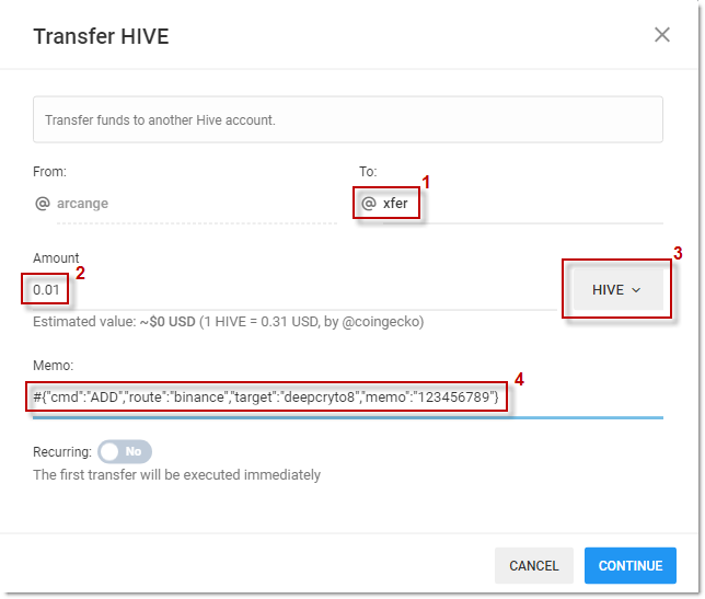 {"cmd":"ADD","route":"binance","target":"deepcryto8","memo":"123456789"}creates a route named "binance" to send assets to the account @deepcrypto8 with the memo "123456789"{"cmd":"ADD","route":"arcange","target":"arcange" }creates a route named "back" to send assets to the account @arcange without memo{"cmd":"ADD","route":"secret","target":"arcange", "#an encrypted memo" }creates a route named "secret" to send assets to the account @arcange with a memo that will be encrypted
