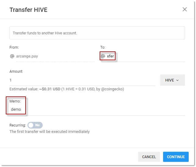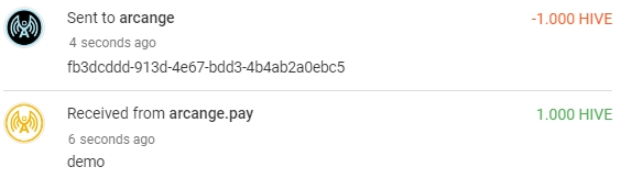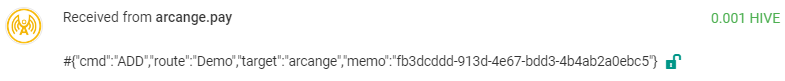 Let's consider the account @arcange.pay has created a route by sending HIVE to the account @xfer with the following memo:
